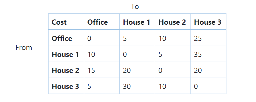 For this scenario, let us assume he travels from his office to three houses and then back to the office. And, the traveling cost between the office and houses are given below in the table: